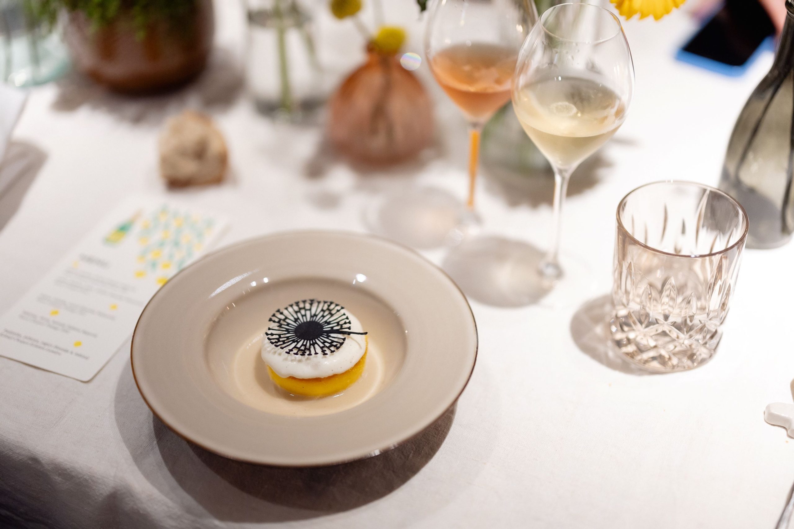 Naravno, na kraju večeri uslijedio je pravi solaire desert, koji su Ksenija i Sabina osmislile zajedno, a u kojem se ispod tankog, hrskavog kruga žutog meringue krio sladoled od estragona s kremom od marakuje i hrskavim lješnjacima, lagano zapjenjen, koji je simbolizirao Solaire Tables kraški jogurt s bazgom.