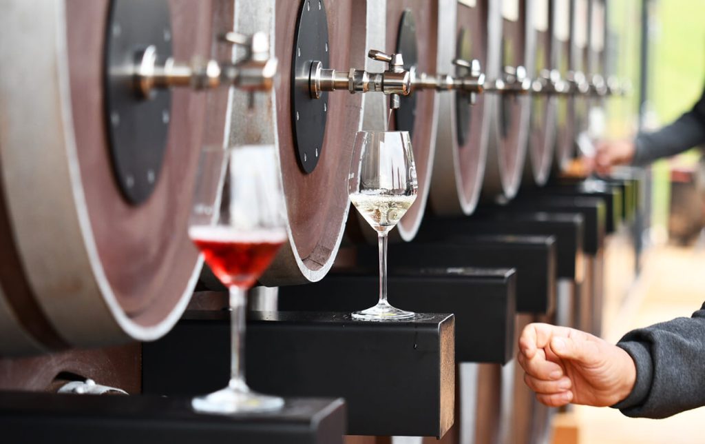 Sa specifičnom degustacijskom čašom, koja je opremljena programiranim čipom, možete kušati 6 uzoraka vina koje birate između osam različitih bačvi (4 sata može proći od prvog točenja do posljednjeg šestog uzorka). U ponudi su bijela suha, polusuha i slatka vina, rose i dva suha crvena uzorka.