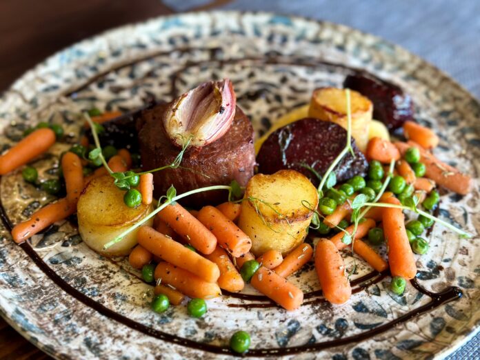 Naslovna fotografija: DIK-DIK – Filet mignon s confitom od krumpira, aromatiziran ružmarinom, mladom mrkvom, ljutikom, kockicama cikle na kremi od kukuruza i demiglasu od povrća.